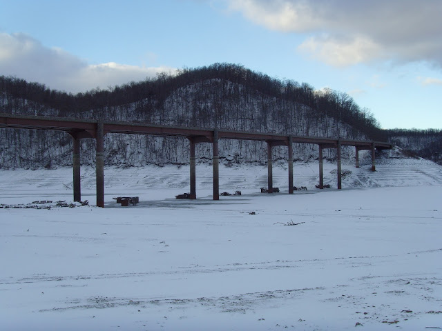 As you drive down Rt 40, across the Youghiogheny reservoir heading towards Maryland, you might not notice what lies underneath you. Somerfield became a town in 1818. It existed for over 100 years until the 1940's. In 1942 the Yough was dammed and the town of Somerfield was abandoned to make room for the newly forming lake. Every so often, the water levels recede and the old stone bridge that was the original Rt. 40 and derelict sidewalks of the town will show themselves. The first image courtesy of gribblenation.com, and the two non snowy pictures courtesy Vince Ferrari. The remainder are from a recent trip through the area.